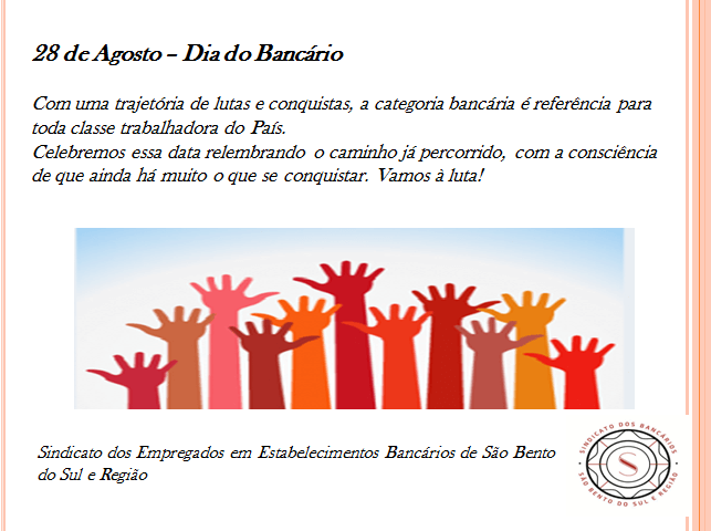 DIA NACIONAL DOS BANCÁRIOS – 28/08 Publicado em 28 de agosto de 2019 | Geral Compartilhe isso:Clique para compartilhar no Twitter(abre em nova janela)Clique para compartilhar no Facebook(abre em nova janela) Relacionado
