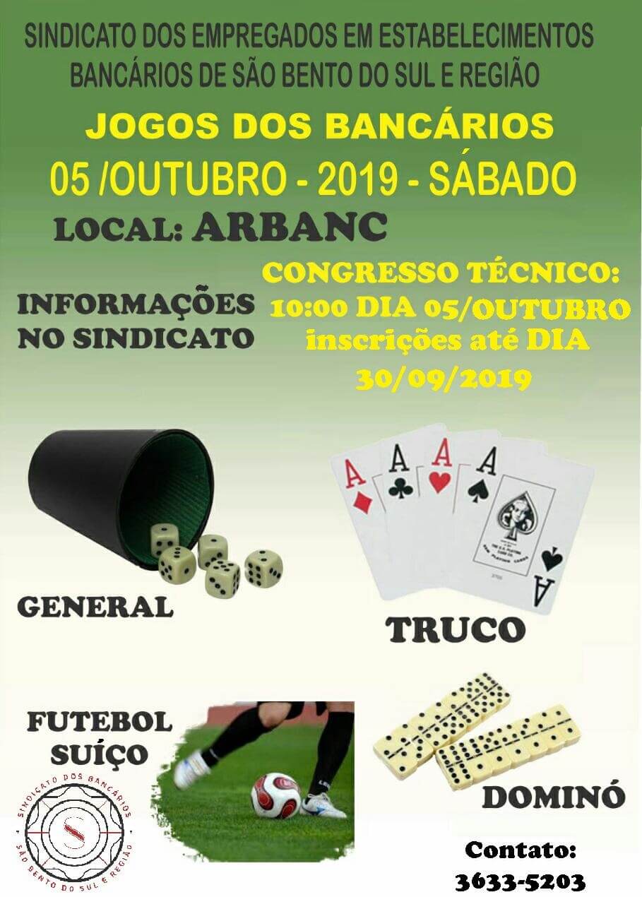 O Sindicato dos Bancários de São Bento do Sul e Região, promoverá mais uma edição dos Jogos Bancários de São Bento do Sul, Rio Negrinho e Campo Alegre.