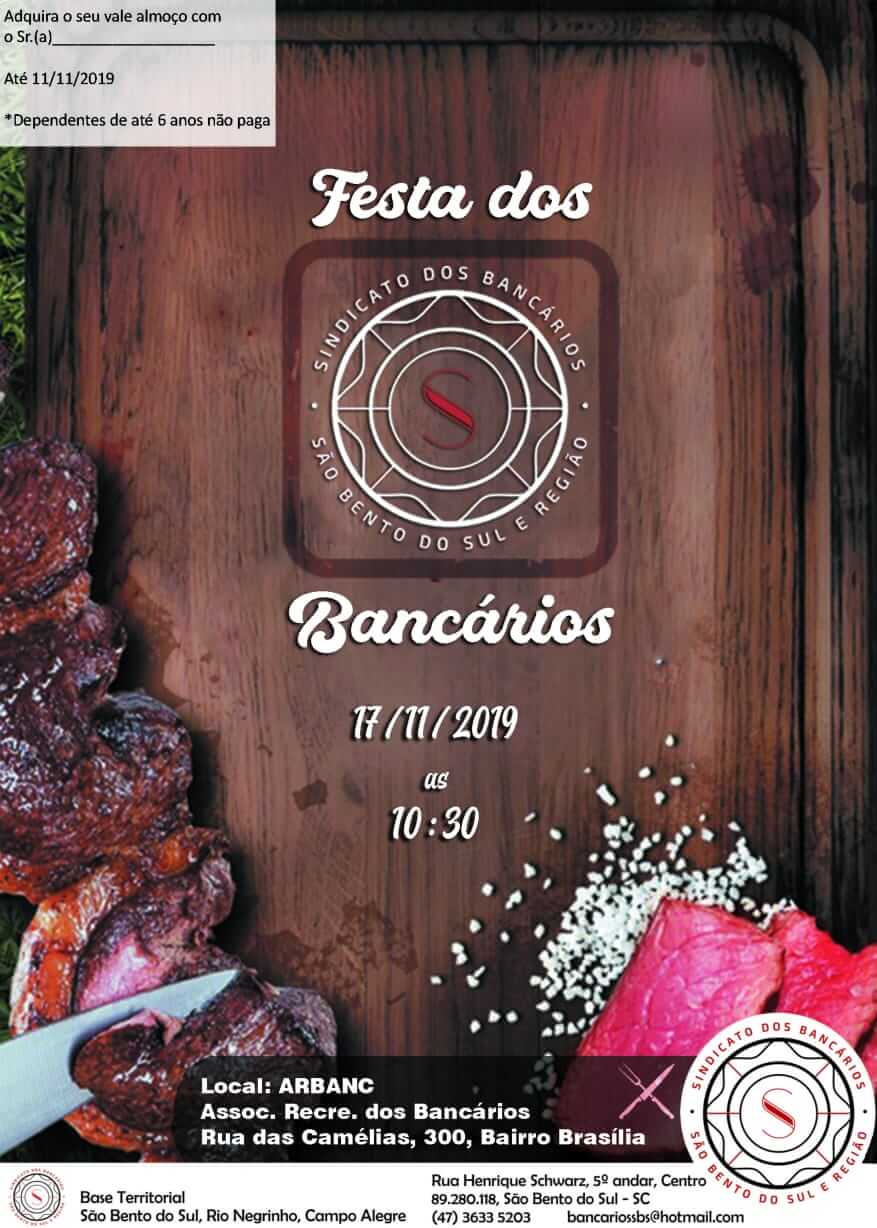 O Sindicato dos Bancários de São Bento do Sul e Região, promoverá no dia 17/11 (domingo), com início às 10h30, à tradicional Festa dos Bancários, que será realizada, na sede Recreativa dos Bancários (ARBANC).