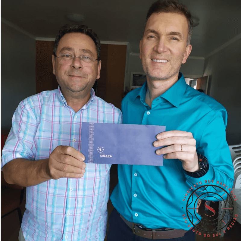 O bancário Júlio Cesar da Cunha, funcionário do Banco do Brasil (agência 0674- São Bento do Sul), recebeu de Roberto Ortiz o prêmio sorteado pelo sindicato, e oferecido pelo Hotel Sibara Flat & Convenções, que consiste em 2 (duas) diárias + café da manhã, em data a ser agendada. Júlio e sua esposa Luciana, também funcionária do BB, são associados do Sindicato dos Bancários.